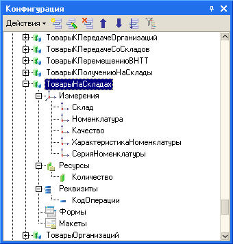 В конфигурации описан регистр накопления ТоварыНаСкладах: